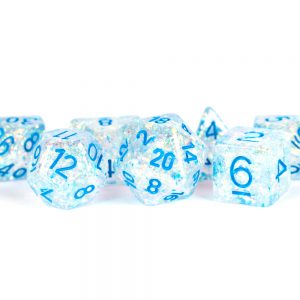 Metallic Dice Games 16mm Resin Flash Dice Poly Dice Set: Clear with Light Blue Numbers