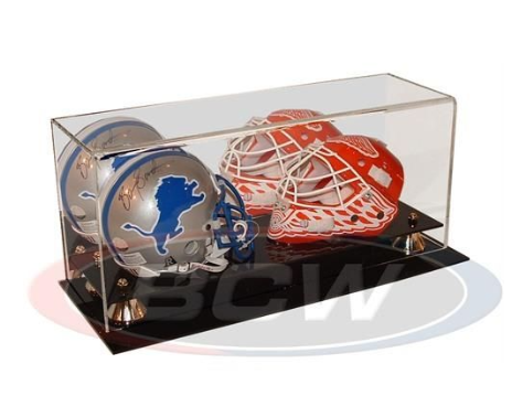 The BCW Deluxe Acrylic Mini Helmet Display Case features a black base with gold risers, clear cover, and a mirrored back. Use this sports memorabilia holder to protect, store and display your collectible mini helmets from companies like and others.
